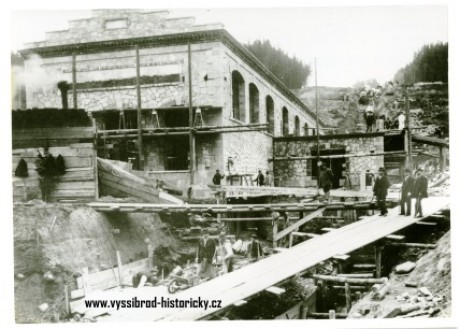 Před r.1902 - Stavba haly hydrocentrály, pohled od východu. Výkop vepředu - budoucí odpadní kanál od turbín. Vpravo nahoře sestavování tlakového potrubí.